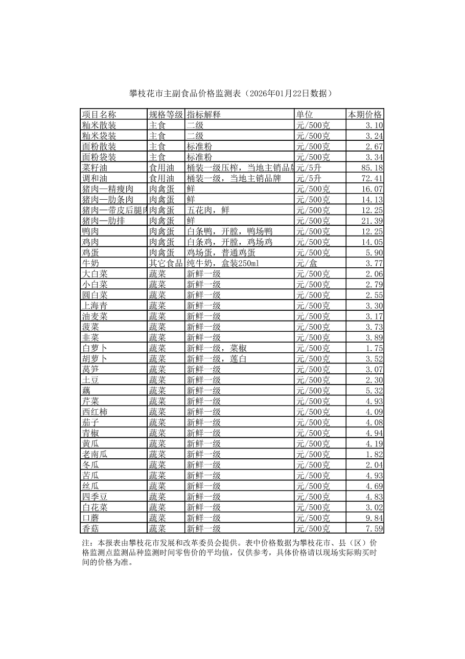 攀枝花市主副食品价格监测表(2026年01月22日数据)