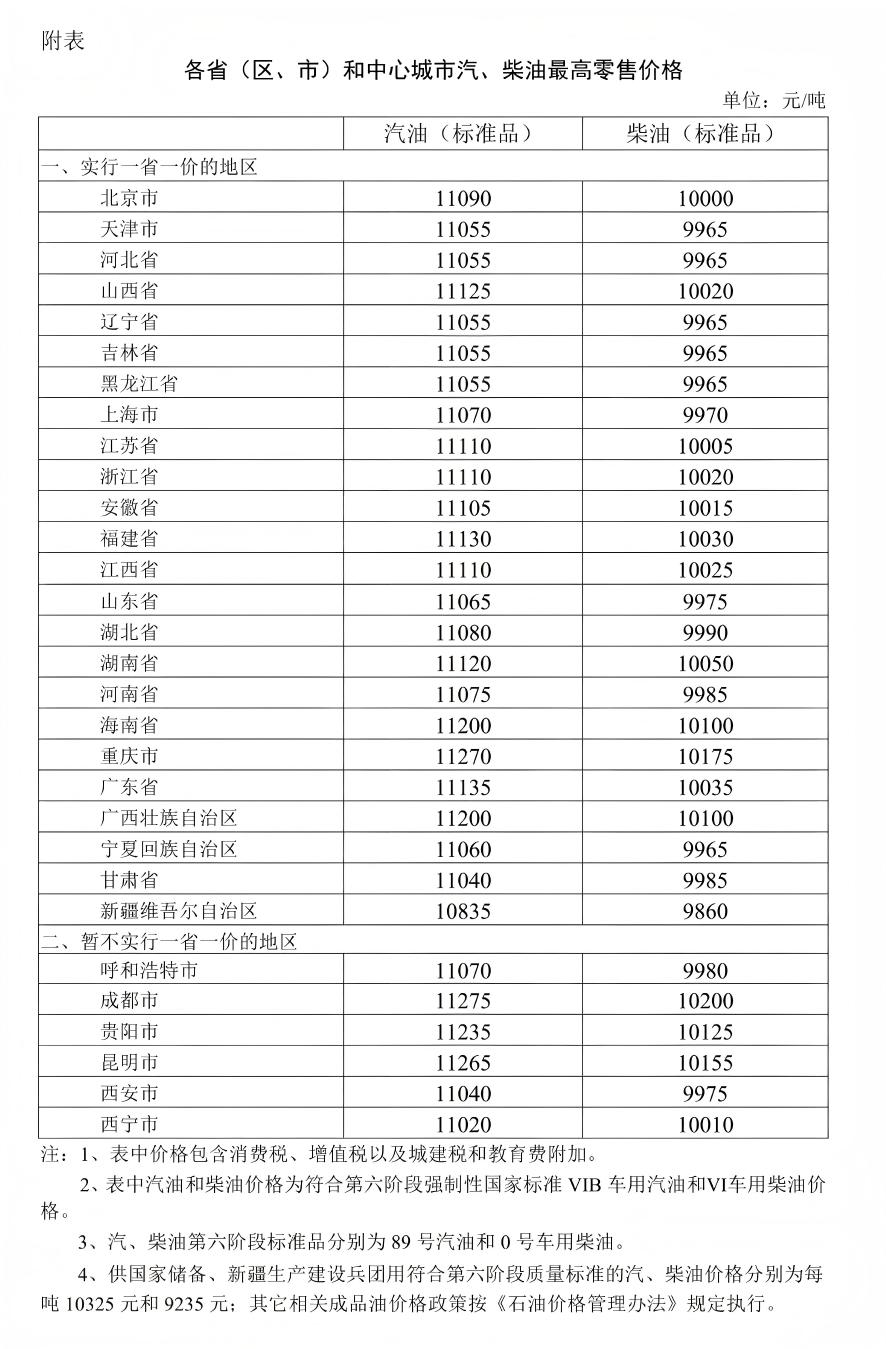 附:各省(区、市)和中心城市汽、柴油最高零售价格